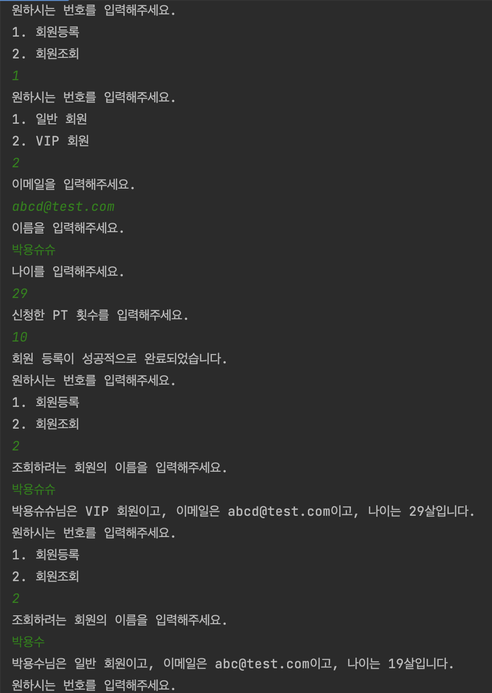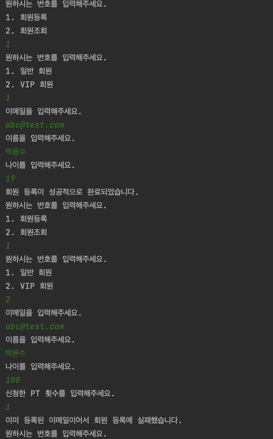 - VIP 회원을 등록할 때는, 이메일, 이름, 나이, 신청 PT 횟수 정보를 받아야 한다.
