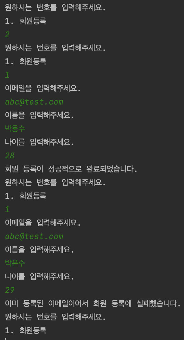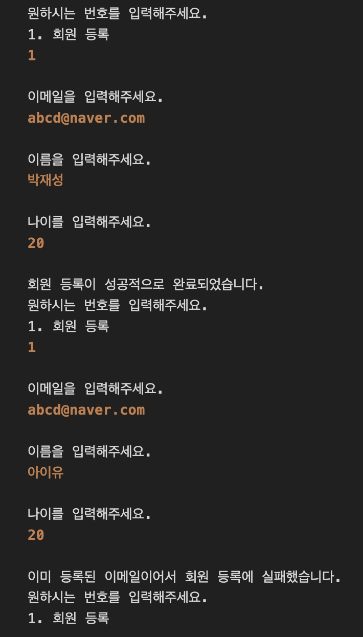 System.out.println("이미 등록된 이메일이어서 회원 등록에 실패했습니다.");