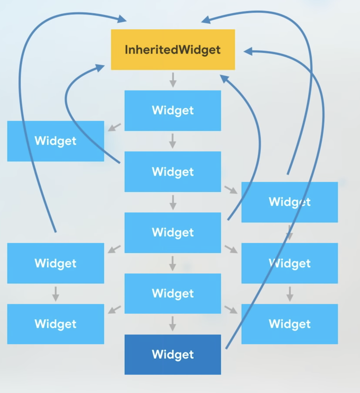 복잡한 구조의 위젯 트리에서, 변화가 필요한 위젯이 트리의 마지막 부분에 위치하게 된다면 불필요한 데이터의 전달이 일어나게 된다. 이를 방지하기 위해 Flutter에는 InheritedWidget이라는 개념이 존재한다. InheritedWidget을 통해 효율적으로 데이터를 트리 아래로 전달할 수 있다.