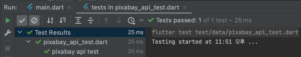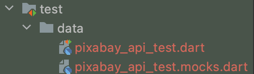 어노테이션을 통해 Mock 객체를 생성할 수 있고, 나는 Dio를 사용하기 때문에 @GenerateMock([Dio])의 형태로 어노테이션을 사용했다. 이 후 Terminal에 코드 생성 명령어를 입력하면 pixabay_api_test.mock.dart 파일이 생성된다.