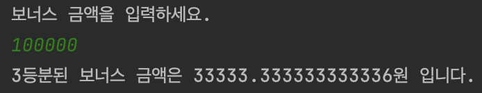 System.out.println("3등분된 보너스 금액은 " + part + "원 입니다.");