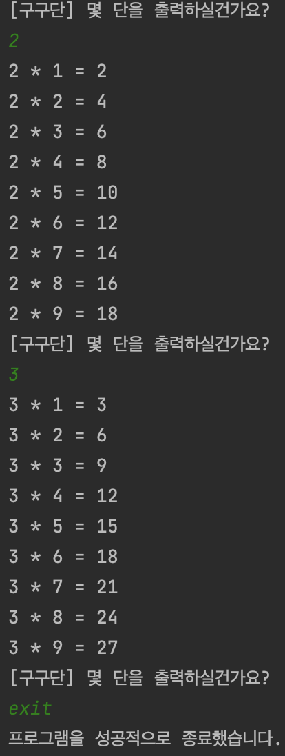 - exit 입력하여 '프로그램을 성공적으로 종료했습니다.'를 출력하기 전까지 구구단 출력 질문